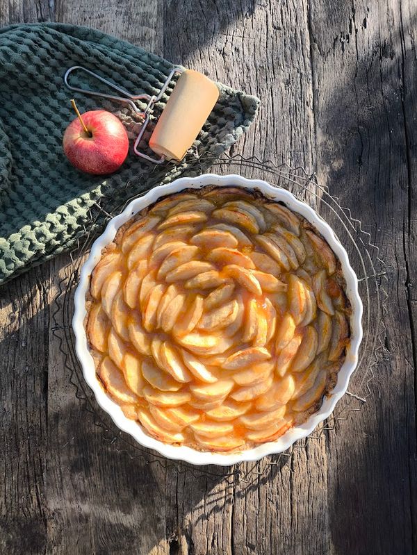 Die Apfeltarte für ca 35 bis 40 Minuten backen, die Äpfel sollen weich und leicht bräunlich werden.