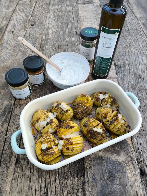 Alles miteinader vermengen, 15 Minuten ziehen lassen und zu den Fächerkartoffeln servieren.